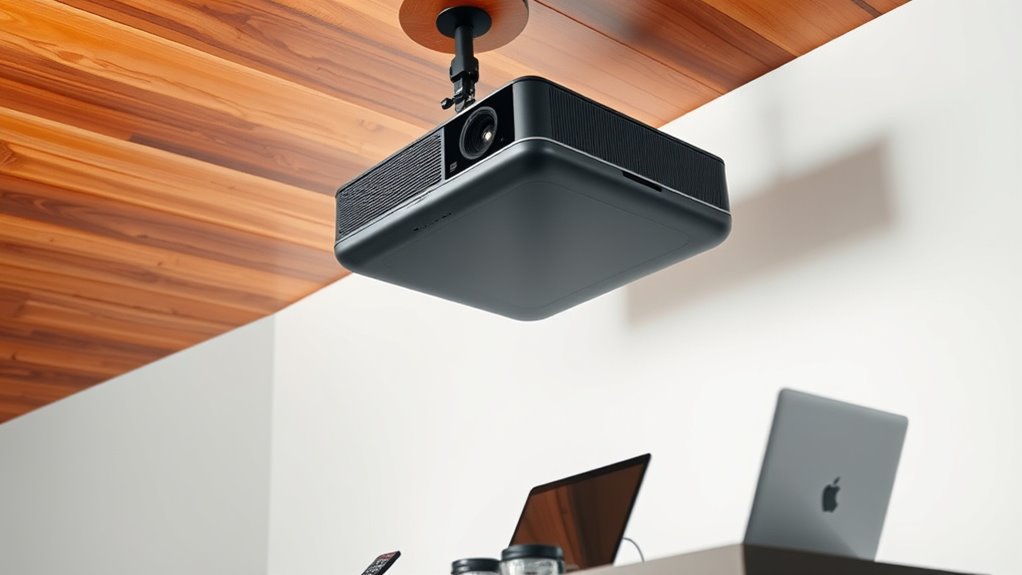 You’ll want the right mounting options to navigate installation challenges smoothly. Some projector mounts are better suited for angled setups, offering flexible adjustments and sturdy support. Fixed mounts might struggle, causing shaky images, while adjustable mounts let you tilt and shift effortlessly, like turning a dial on a well-tuned instrument. Choosing the right mount guarantees your projection stays sharp and steady, even when you’re working with tricky angles.