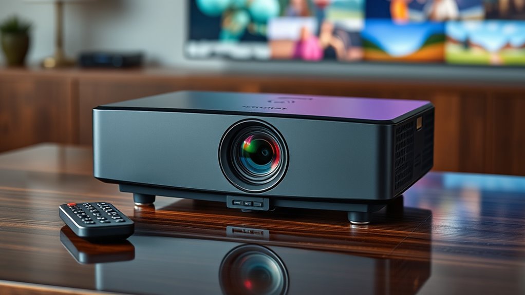 A typical projector can store around 3 to 10 aspect ratio presets, depending on the model. You can customize these presets through lens calibration, adjusting for different screen sizes and aspect ratios. Using preset customization, you can quickly switch between settings for various content formats, ensuring the best image quality. This flexibility helps you manage multiple aspect ratios efficiently, making your viewing experience seamless and tailored to your needs.