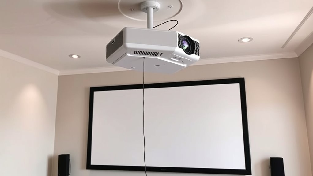 Mounting a projector might seem straightforward, but skipping careful planning can lead to frustrating issues like poor image quality or uneven alignment. One of the most critical steps is getting the projection screen placement right. You need to consider the size and position of the screen relative to your seating area, ensuring everyone has a clear view without distortion or shadows. If you place the screen too high or too low, viewers might have to strain or shift awkwardly to see the display properly. Think about the distance between the projector and the screen as well; too close, and the image may be unclear or distorted, too far, and it won’t fit the space well. Proper placement guarantees ideal image sharpness and brightness.