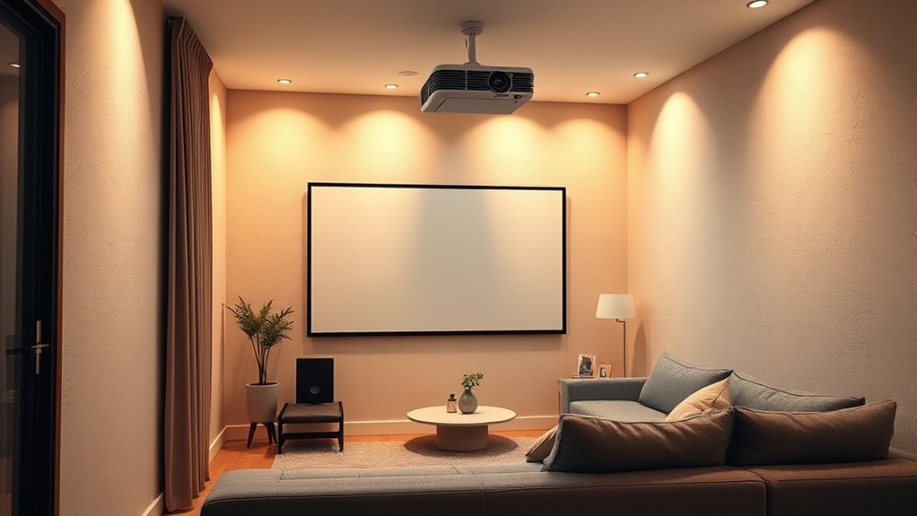 Are shadows and glare disrupting your small room viewing experience? To minimize these issues, focus on strategic screen placement and controlling ambient lighting. First, position your screen so that windows and light sources are not directly behind or beside it. Second, use blackout curtains or blinds to block sunlight during viewing. Third, adjust ambient lighting by avoiding bright lights near the screen, which causes glare. Fourth, consider mounting lights overhead or behind your seating area to reduce reflections. Proper screen placement ensures your projector’s image remains clear and shadows are minimized. Managing ambient lighting helps prevent unwanted glare, enhancing picture quality. Additionally, choosing appropriate projector placement can significantly reduce shadows and improve overall viewing comfort. Combining thoughtful screen positioning with controlled lighting creates a more comfortable, glare-free environment for your small room projector setup.