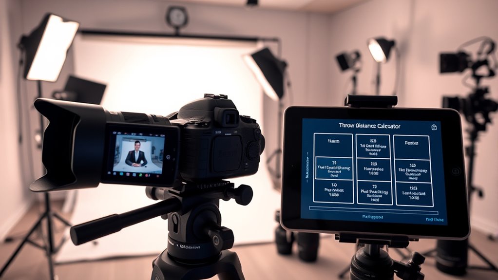 Using a throw distance calculator helps you plan your setup precisely by considering your room dimensions and projector specifications. It guides you on where to position your projector for the desired screen size and ideal viewing experience. You can quickly adjust variables like screen size and projector type to see how they impact placement. This tool simplifies installation, prevents errors, and guarantees your setup looks perfect. Keep exploring to discover more ways to maximize your projection environment effectively.