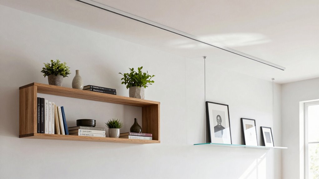 When deciding how to install your storage or display units, understanding the differences between shelf mounting and ceiling mounting can substantially impact your space’s functionality and aesthetic. Shelf mounting offers a versatile way to display decorative options like books, plants, or collectibles, giving you the freedom to choose various styles and materials to match your room’s decor. You can opt for floating shelves, traditional wooden planks, or metal brackets, all of which add personality and visual interest. The installation process for shelves is relatively straightforward, especially if you have basic tools and skills. Most shelves can be mounted directly onto the wall using brackets or anchors, making it easy to adjust the height or replace them down the line. This simplicity allows you to customize your space quickly, often without professional help. Additionally, installation methods for shelves are generally accessible for DIY enthusiasts, further simplifying the process. When considering wall space and room layout, shelves can be positioned to maximize utility and style without overwhelming the area. Moreover, choosing the right type of mounting hardware can enhance stability and safety, especially if you plan to hold heavier items.