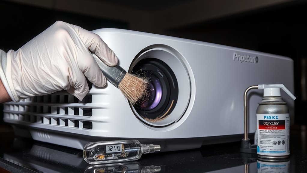 Regular cleaning and maintenance are essential to keep your projector running smoothly and prevent overheating issues. Start by cleaning the lenses carefully to guarantee clear image projection. Dust accumulation inside the projector can block airflow and cause overheating, so regularly remove dust from vents and internal components with compressed air. Be gentle to avoid damaging delicate parts. Wipe exterior surfaces with a soft, damp cloth to remove dirt and debris. Keep an eye out for signs of dust buildup, which can hinder cooling fans and airflow. Consistent maintenance helps maintain peak performance and extends your projector’s lifespan. By staying proactive with cleaning and dust removal, you reduce the risk of overheating and ensure your projector operates efficiently every time you use it. Incorporating proper lifestyle habits, such as scheduling regular cleaning routines, can significantly improve your device’s longevity.