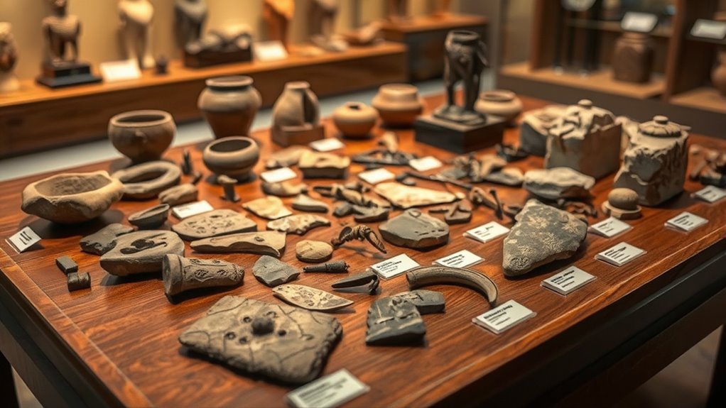 Think of your artifacts as delicate treasures that need a fortress of care. You should store them in a climate-controlled environment, where temperature and humidity stay steady like a calm lake. Proper labeling is essential, like giving each artifact a name tag that tells its story. Keep them away from sunlight and pollutants, and guarantee they’re stored in acid-free containers to preserve their integrity for generations to come.