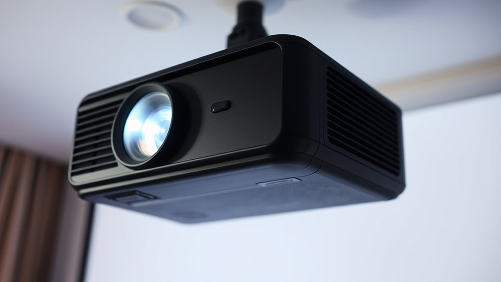 Think of your projector’s focus adjustment like tuning a musical instrument—you want it just right. You should calibrate your projector’s focus every 3 to 6 months or whenever image sharpness declines. Regular calibration keeps the picture crisp and clear, preventing blurry visuals. If you notice fuzziness or shifting focus, don’t wait—perform focus adjustment promptly. Staying on top of calibration frequency guarantees your projector consistently delivers a sharp, vibrant display.