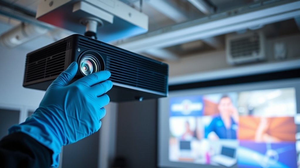 To fix common projector issues quickly, start by checking and securing all cables, swapping them if needed. Use your device’s display settings to match duplicate or extend modes and guarantee the projector recognizes your laptop. For image issues, adjust keystone correction, focus, and projector positioning to improve clarity and alignment. Regularly clean the lens and verify proper input source. If problems persist, more tips await to help you troubleshoot efficiently and keep your presentation on track.