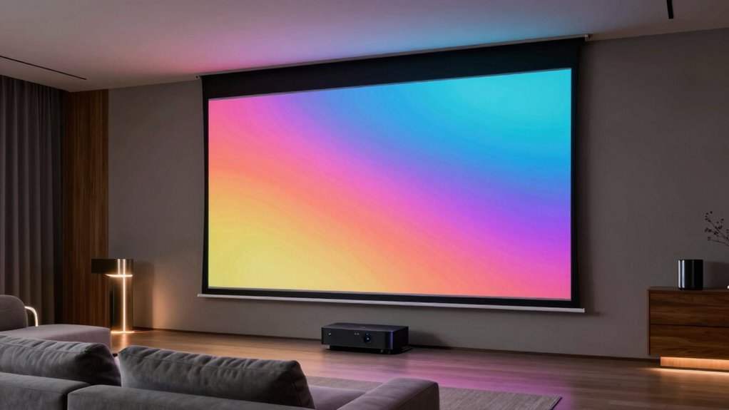Have you thought about how many people will be watching your 135-inch projector screen? The viewing angle range is key to ensuring everyone sees a clear, vibrant picture. A broader angle, like 160°, allows viewers from different seats to enjoy consistent brightness and color without distortion. If your setup includes a large group or wide seating areas, a screen with a 170° viewing angle offers the best experience, providing a wide perspective that minimizes off-center color loss. Conversely, narrower angles can cause brightness reduction or color issues when viewers sit off to the sides. To get the most from your projector, match the screen’s viewing angle to your room’s layout, ensuring all viewers experience ideal image quality, no matter where they’re seated.