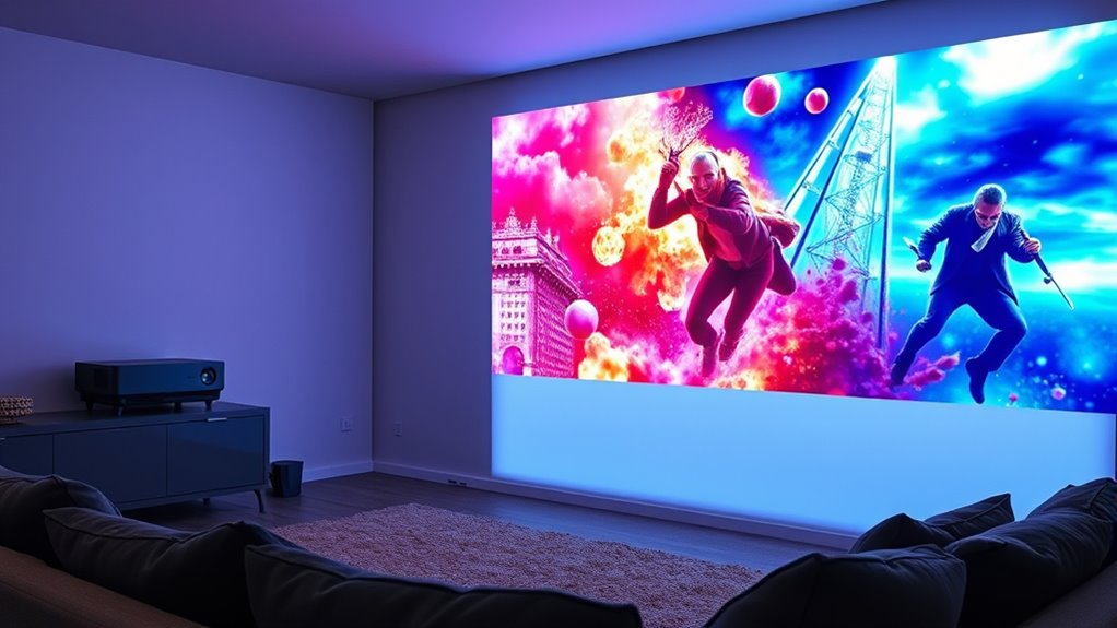 A wide color gamut and high color accuracy are essential for delivering vibrant, lifelike images in your home cinema. A broader color gamut, like 110% BT.2020 or 98% Rec.709, ensures more vivid and true-to-life colors, making your viewing experience more immersive. High color accuracy, indicated by a low Delta E score (around 0.9 or less), minimizes color deviations, so images stay consistent and true to the source. Support for HDR formats such as HDR10 or Dolby Vision further enhances color depth and contrast, adding realism. Advanced laser or high-quality LCD technology can markedly boost color saturation and uniformity across the screen. To maintain precise colors during extended viewing, opt for calibrated projectors that deliver consistent, accurate hues regardless of content or ambient lighting conditions.