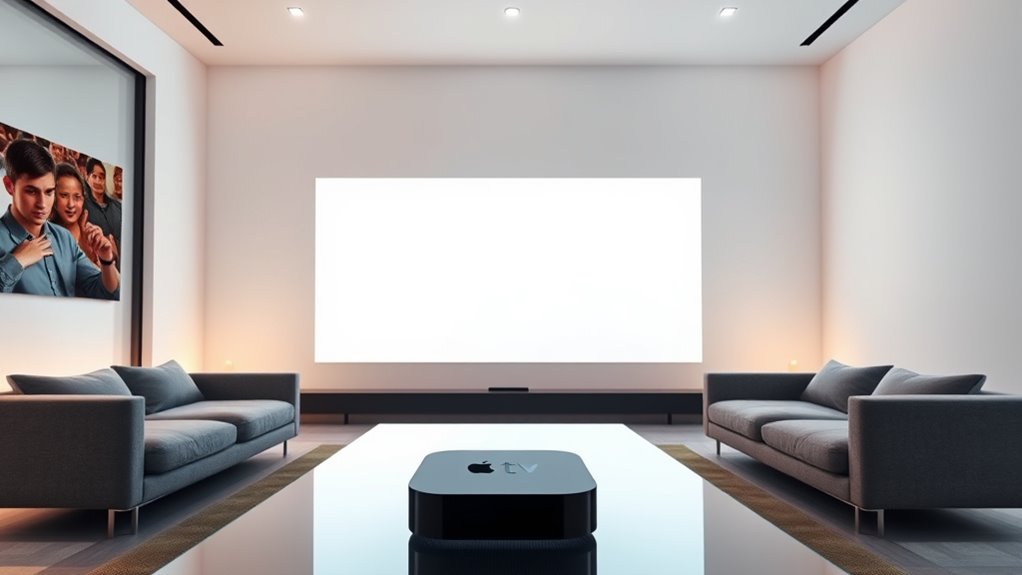 Choosing a 4K projector that works seamlessly with Apple TV requires paying attention to several key compatibility factors. First, verify the projector has an HDMI input, since Apple TV connects via HDMI for video transmission. It’s also important to confirm the projector supports Apple AirPlay, enabling wireless streaming from your Apple devices. Native 4K resolution with HDR support is essential to fully enjoy Apple TV’s 4K content quality. Check whether the projector’s firmware is updated and compatible with Apple’s ecosystem and streaming protocols. Additionally, look for models that support Miracast, DLNA, or other Apple-compatible wireless display technologies for effortless content sharing. Meeting these criteria guarantees a smooth, integrated experience, maximizing your enjoyment of 4K content through your Apple TV.