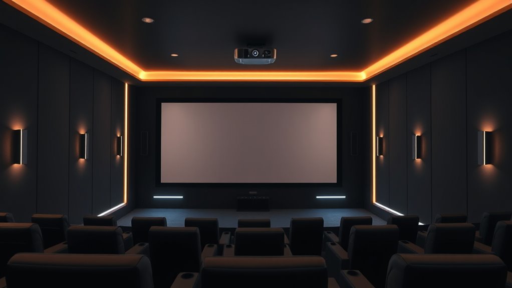 Brightness levels play a vital role in guaranteeing your home theater visuals stay clear and vibrant, especially when lighting conditions aren’t perfect. If your room is bright or has ambient light, you’ll want a projector with at least 2,500 ANSI lumens or higher to maintain a vivid picture. For indoor setups with controlled lighting, 1,500 to 2,500 lumens usually suffice, depending on screen size and light exposure. Outdoor or daytime viewing requires even more brightness—3,000 ANSI lumens or more—to combat sunlight and guarantee clear images. Higher brightness prevents images from looking washed out or faded, particularly on large screens. Just remember, balancing brightness with room lighting and screen size is key to achieving ideal picture quality without excessive glare or loss of detail.
