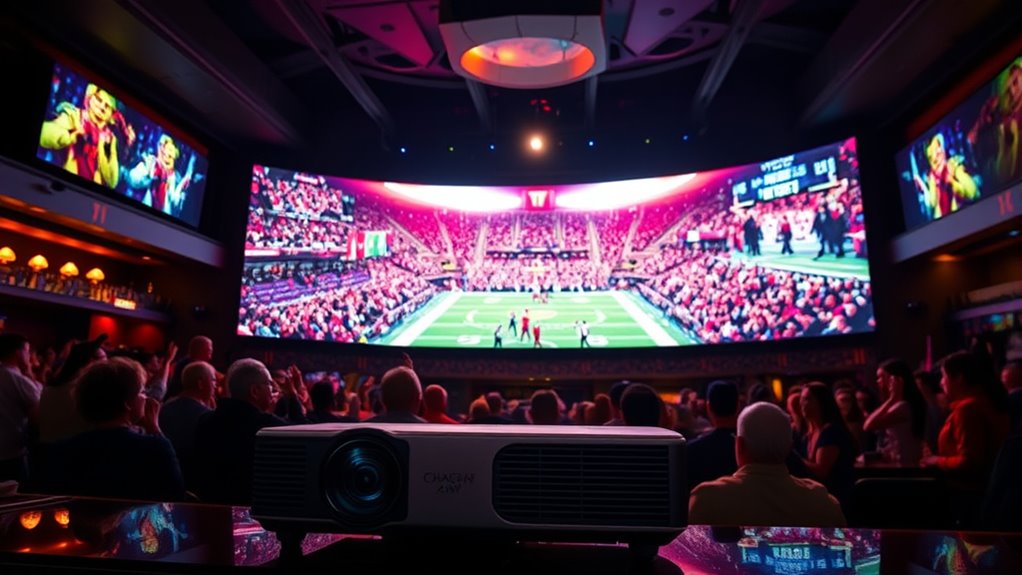 Have you ever noticed how blurry or pixelated fast-moving sports scenes can look on a low-resolution projector? That’s because lower resolutions can’t keep up with the quick motion and intricate details of live sports. A 4K projector, with its 3840×2160 resolution, offers sharper, more detailed visuals, making it easier to see textures like grass, sweat, and facial expressions. The higher pixel density minimizes pixelation and jagged edges, even on large screens, ensuring clarity during rapid action. For the best experience, choose a native 4K projector with a high contrast ratio—around 20,000:1—to deliver vibrant colors and deep blacks. Pairing this with sufficient brightness, like 1500 ANSI lumens or more, guarantees sharp, vivid images even in well-lit sports bar environments.