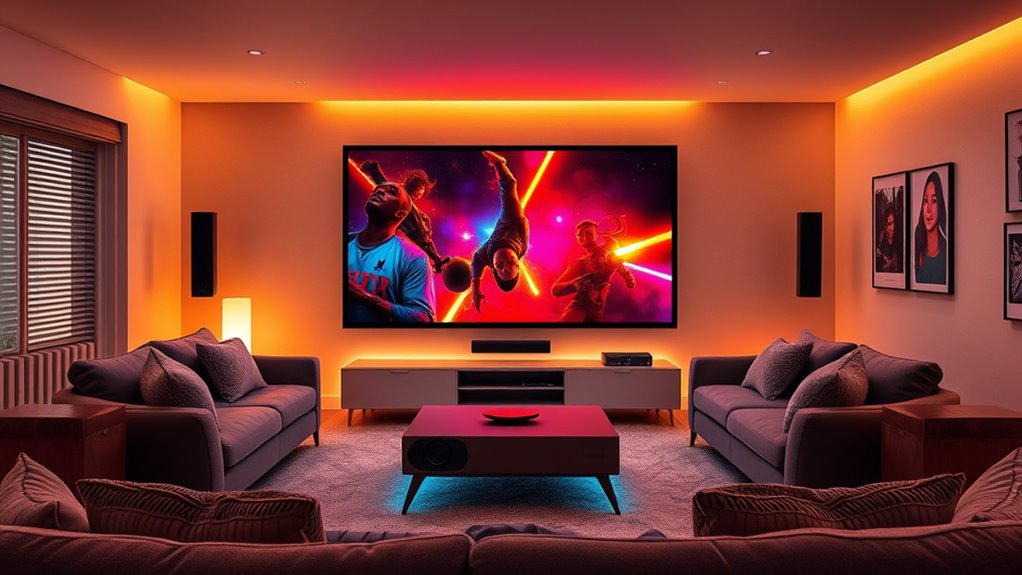 Ambient light is like a fog that can obscure your view, and during Netflix streaming, it can wash out the projector’s bright, vivid images. I’ve noticed that even small changes in room lighting reduce contrast and detail, making scenes less immersive. To get the best picture, I recommend dimming lights or using blackout curtains. A darker room truly reveal the full potential of your 4K projector, delivering crystal-clear, cinematic quality.