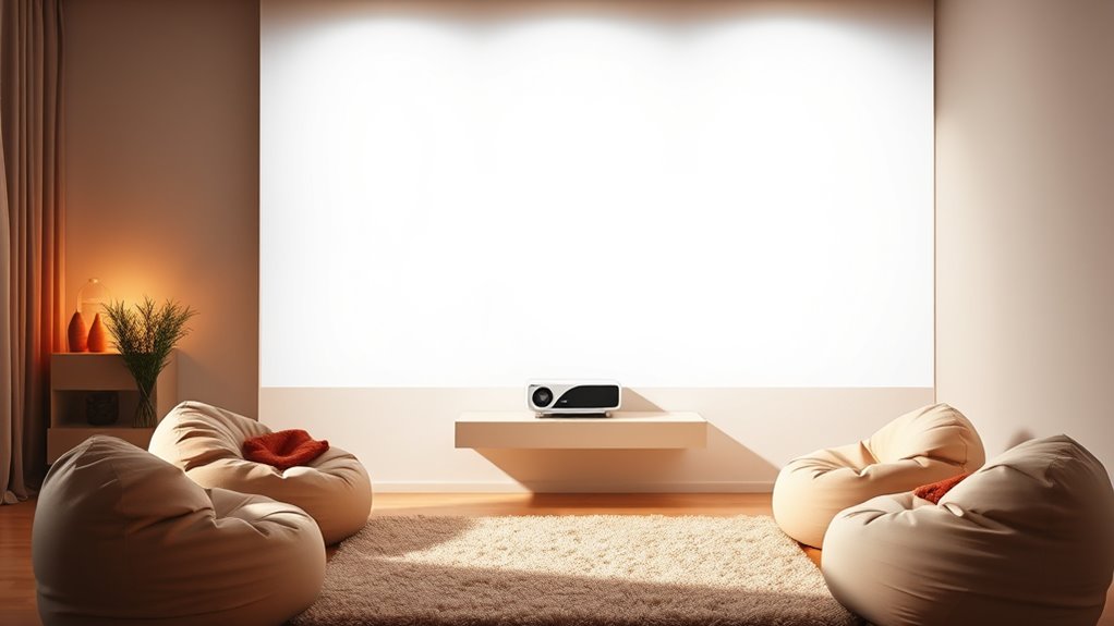 Choosing the right connectivity options is essential to maximize your 4K projector’s versatility and ease of use. Look for models with multiple ports like HDMI, USB, AV, and audio jacks—these guarantee compatibility with a wide range of devices, from gaming consoles to media players. Wireless features like WiFi (preferably WiFi 6) and Bluetooth are also key, allowing seamless streaming and audio pairing without clutter. Screen mirroring technologies such as Miracast, AirPlay, or Chromecast help share content wirelessly from smartphones and tablets effortlessly. Additionally, verify if the projector supports direct content access through built-in smart apps, reducing reliance on external streaming devices. Overall, a variety of connectivity options guarantees your projector adapts to your entertainment needs and simplifies setup.