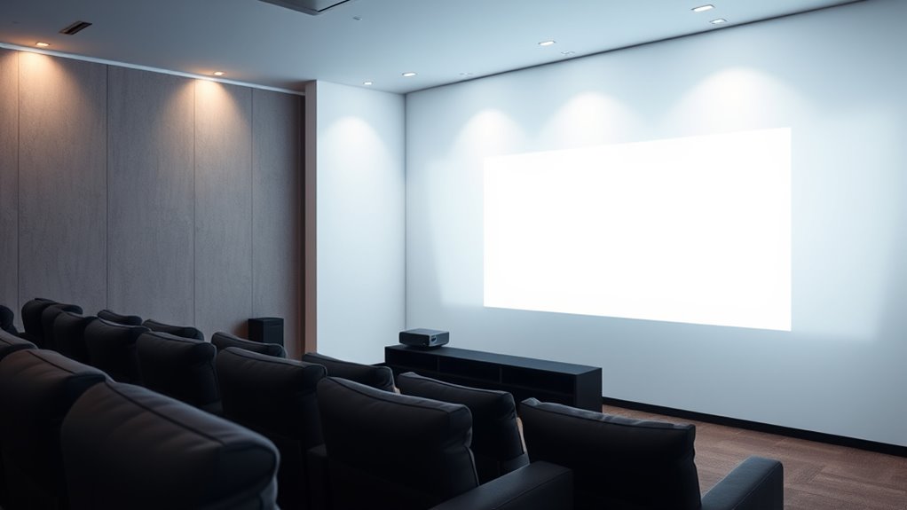 Brightness and contrast are key factors that directly impact the clarity and vibrancy of your projected image. Higher brightness levels, like 1500 ANSI lumens or more, ensure your visuals stay clear even in well-lit rooms, preventing washed-out images. Contrast ratios of 10,000:1 or higher provide deeper blacks and richer colors, adding depth and realism to your picture. These elements work together to enhance detail, especially during fast-moving scenes or intricate visuals. I recommend choosing a projector with adjustable contrast settings so you can fine-tune the image based on ambient lighting. When brightness and contrast are properly balanced, you’ll enjoy sharp, vibrant images that truly stand out, whether you’re watching indoors or outdoors. This combination is essential for a stunning home theater experience.