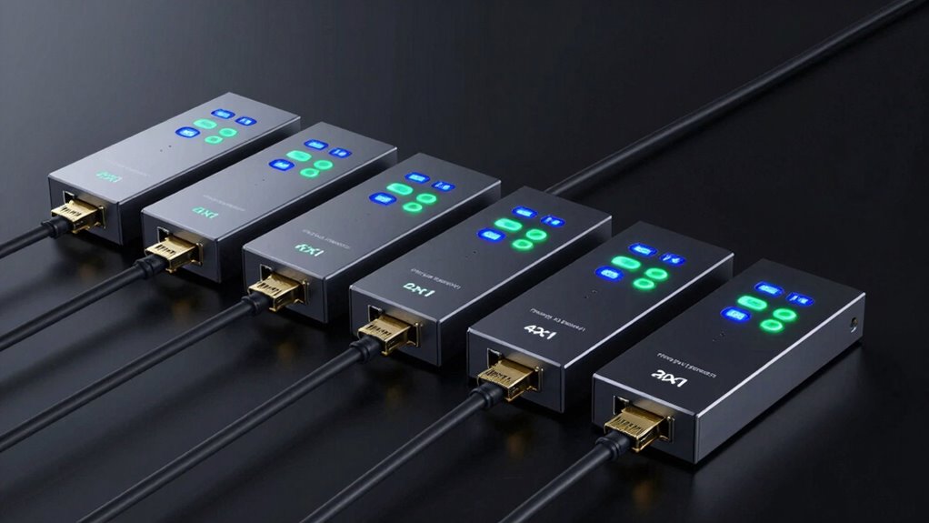 Think of these switchers as the gatekeepers of visual excellence—they do support HDR and Dolby Vision, ensuring your images pop with vibrant colors and deep contrast. I’ve seen them handle high-quality content seamlessly, making your viewing experience immersive. So, if you’re after top-tier visuals, these switchers won’t disappoint. They’re designed to deliver stunning, cinematic-quality images, elevating your home theater or professional setup effortlessly.