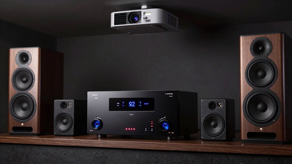 Think of your projector and 9.2-channel receiver as a dance duo, perfectly in sync. To connect them, I start by plugging the HDMI or audio output from my projector into the receiver’s designated input port. Then, I make certain my speakers are correctly wired to the receiver’s channels. Finally, I select the right input on my receiver, and let the symphony of visuals and sound begin to dance seamlessly.