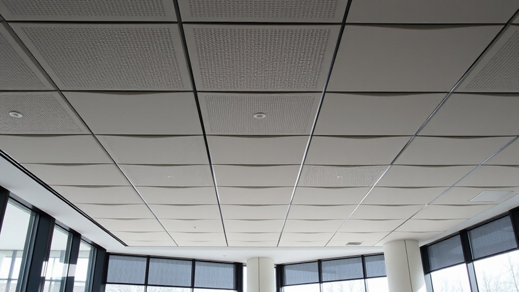 Choosing the right acoustic ceiling tiles depends heavily on their absorption efficiency, which is primarily measured by the Noise Reduction Coefficient (NRC). The NRC indicates how much sound energy the tiles absorb across various frequencies, with higher ratings like 0.70 or above offering superior sound absorption. This reduces echo and reverberation, creating a more comfortable environment. Material composition plays a key role; mineral fiber and foam are common choices due to their excellent absorption properties. Design features such as perforations and surface textures help dissipate sound waves more effectively. Additionally, consider the frequency range targeted—mid and high frequencies are vital for controlling specific noise issues. Selecting tiles with ideal NRC ensures your space remains both stylish and acoustically comfortable.