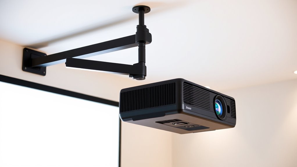 Selecting an adjustable projector mount requires paying close attention to its range of motion, as this directly impacts your ability to achieve the perfect projection angle. A good mount should offer tilt angles from ±15° to ±90°, allowing you to fine-tune the vertical alignment. Swivel capabilities up to 360° give you flexibility to adjust horizontally, while extension lengths from 5 inches to over 25 inches help accommodate different ceiling heights and distances from the screen. It’s essential that the adjustment ranges match your room’s layout to avoid over- or under-adjusting. Ensuring the mount can handle the full spectrum of desired angles and distances without sacrificing stability or safety is key. This flexibility ensures seamless setup and ideal viewing experience.