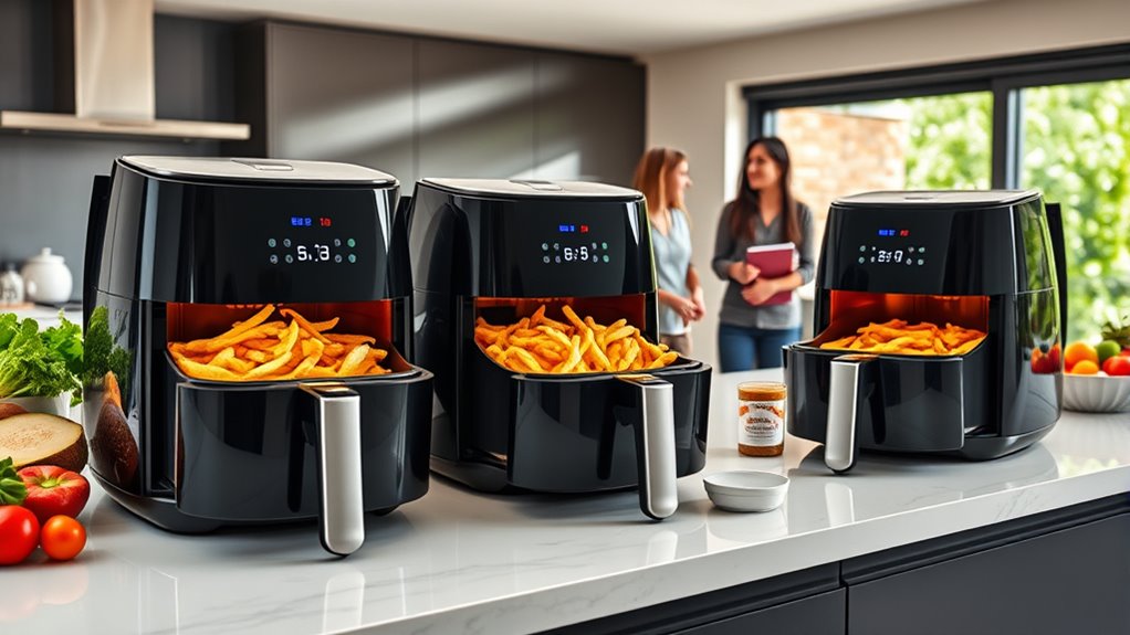 Did you know that many large-capacity air fryers can use up to 20% less energy than traditional ovens? I’ve found they’re surprisingly energy-efficient, especially with their rapid cooking technology that heats up quickly and uses less power. Plus, their larger size means you can cook more in one go, saving time and energy overall. So, if you’re mindful of your electricity bill, these air fryers are a smart choice.