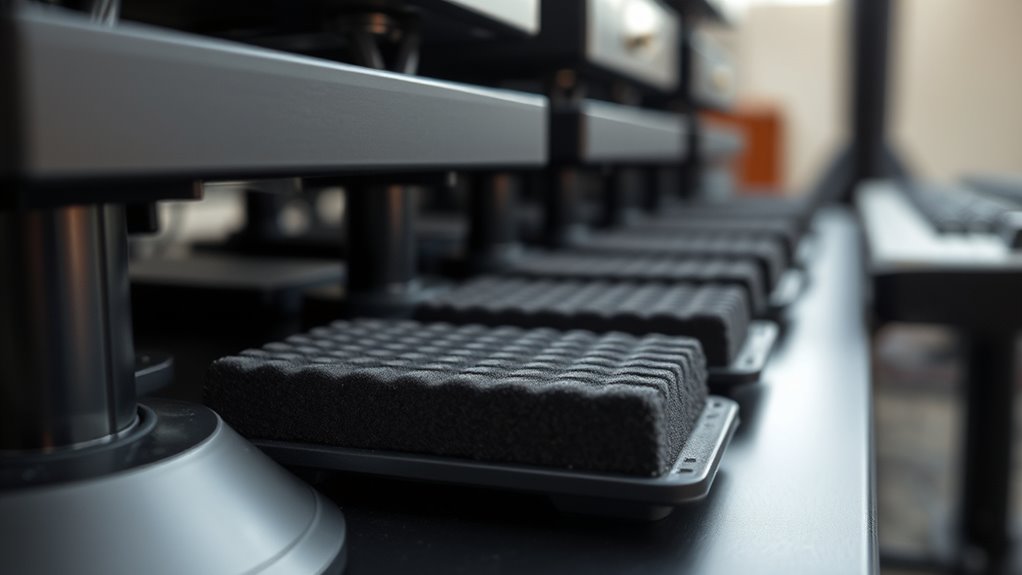 The vibration absorption efficiency of anti-vibration pads hinges largely on their material’s damping properties, as softer, viscoelastic materials tend to provide better vibration isolation. Thicker pads with layered or sandwich structures can absorb more energy, reducing vibration transmission effectively. The presence of pre-drilled holes or anchoring features helps maintain contact and optimize damping under dynamic loads. The hardness rating, measured in durometer, also plays a role; softer materials like low-durometer rubber or EVA foam offer higher damping but may sacrifice durability. Additionally, the pad’s design, including surface texture and contact area, impacts overall performance. Increased surface contact enhances energy absorption, making the pad more effective at minimizing vibrations and noise, ultimately improving stability.