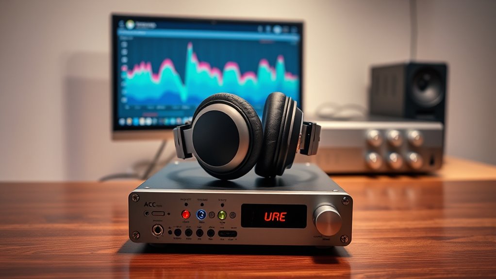 A well-designed feature set can substantially enhance your experience with an audiophile headphone DAC combo. Look for models that include extensive control options like gain switches, EQ adjustments, and smooth volume knobs, allowing you to fine-tune sound to your liking. Easy access to buttons or dials for playback modes, output levels, and sound profiles makes quick adjustments effortless. Dedicated controls for input selection, balance, and output modes enable seamless switching between sources and headphones. Visual indicators, such as high-definition displays or LED lights, help you monitor sampling rates, gain settings, and output modes precisely. Additionally, customizable features like parametric EQ, filter modes, or preset sound profiles broaden your listening flexibility, ensuring your setup can adapt to different genres and preferences for a truly personalized listening experience.