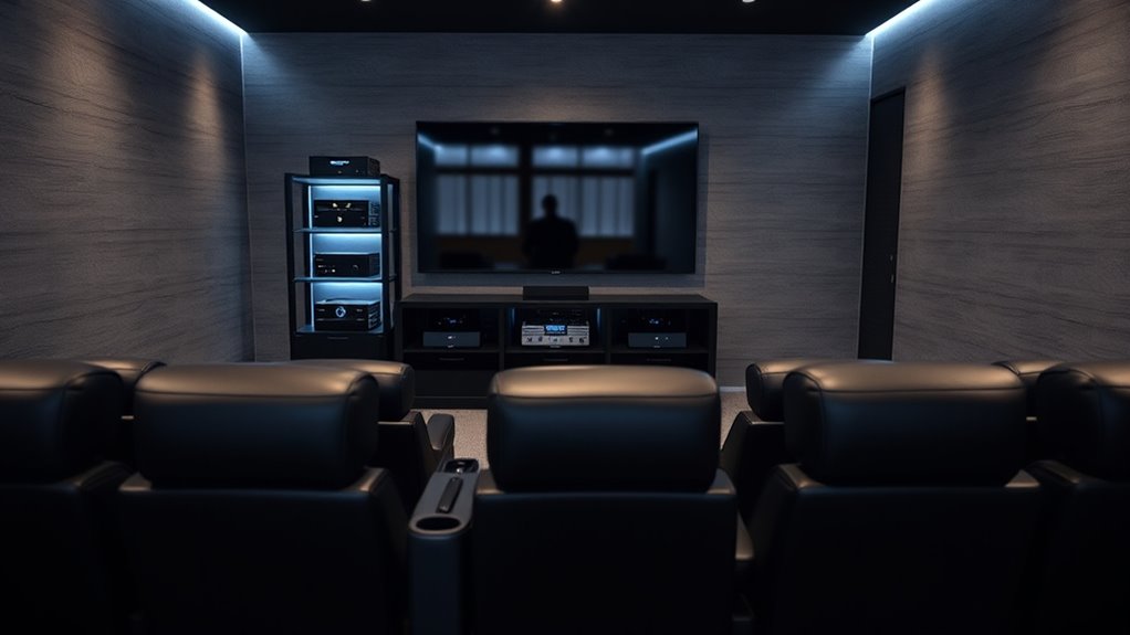 If you’re looking to set up a seamless home theater in 2025, choosing the right AV equipment rack is essential. I recommend considering open frame, wall-mounted, or lockable cabinets to suit your space and security needs. The best racks support your gear’s size, provide good airflow, and are durable enough for heavy equipment. Keep an eye on features like cable management and ease of access. Stick around, and I’ll help you find the perfect fit for your setup.