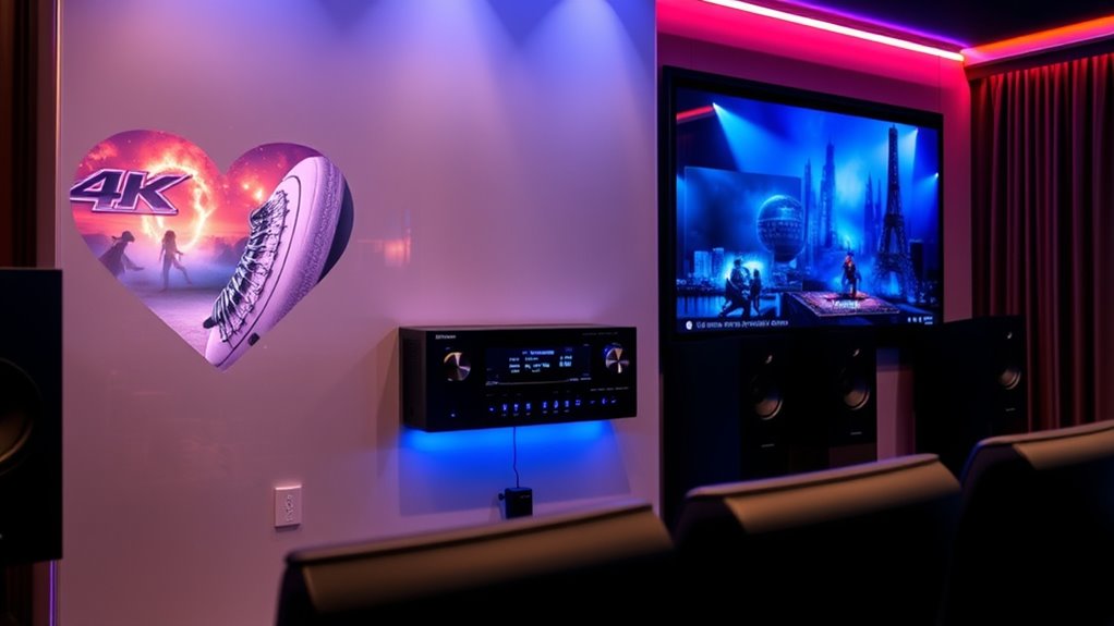 To create an immersive projector setup, it is vital to pay close attention to the surround sound capabilities of your AV receiver. Support for Dolby Atmos and DTS:X is essential, as these formats deliver multi-dimensional sound that surrounds you from all directions, height included. The number of channels, such as 5.1 or 7.2, determines how many speakers and subwoofers you can connect, directly affecting the level of immersion. Virtual surround sound technologies like Dolby Atmos Height Virtualizer also enhance the experience by simulating three-dimensional audio without extra speakers. Additionally, multi-zone audio support allows you to distribute surround sound to multiple areas, enriching your overall home theater environment. Compatibility with various sound codecs ensures clarity and realism, making your projector experience truly cinematic.