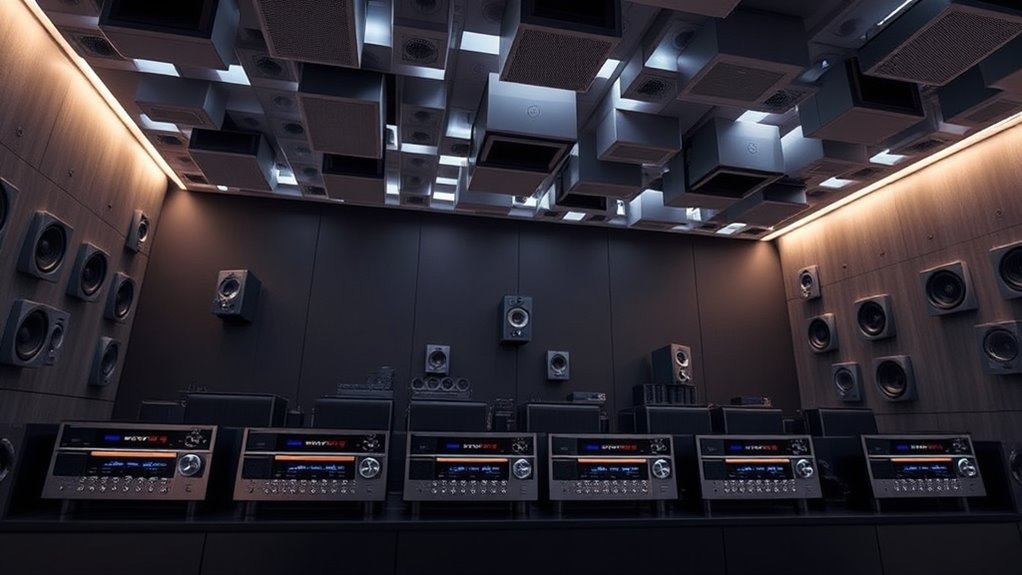 Room calibration features play a crucial role in enhancing your Dolby Atmos experience by automatically adjusting speaker levels, distances, and equalization to suit your room’s unique acoustics. Advanced calibration systems use microphones and proprietary algorithms to analyze reflections, reverberation, and speaker placement, ensuring ideal sound quality. Some AV receivers offer multi-point calibration, allowing precise tuning for multiple listening zones within the same room. Effective calibration can compensate for acoustic anomalies like bass nulls or peaks, resulting in a balanced, immersive sound. These features help maintain consistent audio performance regardless of room size, shape, or furniture arrangement, considerably enhancing clarity and depth. Ultimately, robust calibration capabilities make a noticeable difference in achieving a true cinematic experience in your home theater.