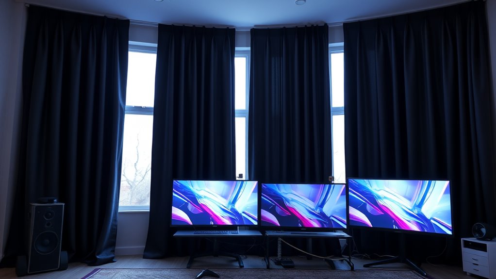 Blackout curtains considerably improve screen visibility by blocking out external light sources, reducing glare that can strain my eyes. They create a darker environment, making details on the screen clearer and colors more vibrant. I’ve found they help me focus better during gaming or streaming sessions, preventing reflections and minimizing distractions. Overall, blackout curtains make my gaming setup more immersive and enjoyable by controlling lighting conditions effectively.