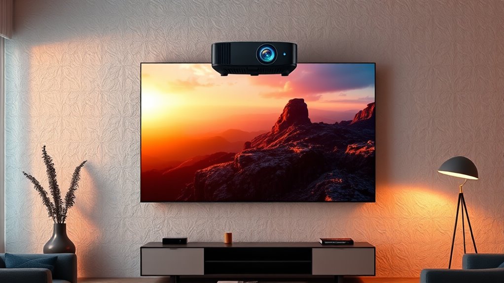 Ambient light can considerably impact image quality, making it harder to see details and reducing contrast. In bright rooms, images may appear washed out, so I recommend using a projector with high brightness levels or installing blackout curtains. In darker environments, you’ll enjoy sharper, more vibrant visuals. Adjusting your lighting setup helps optimize your viewing experience, ensuring you get the best picture quality regardless of ambient light conditions.