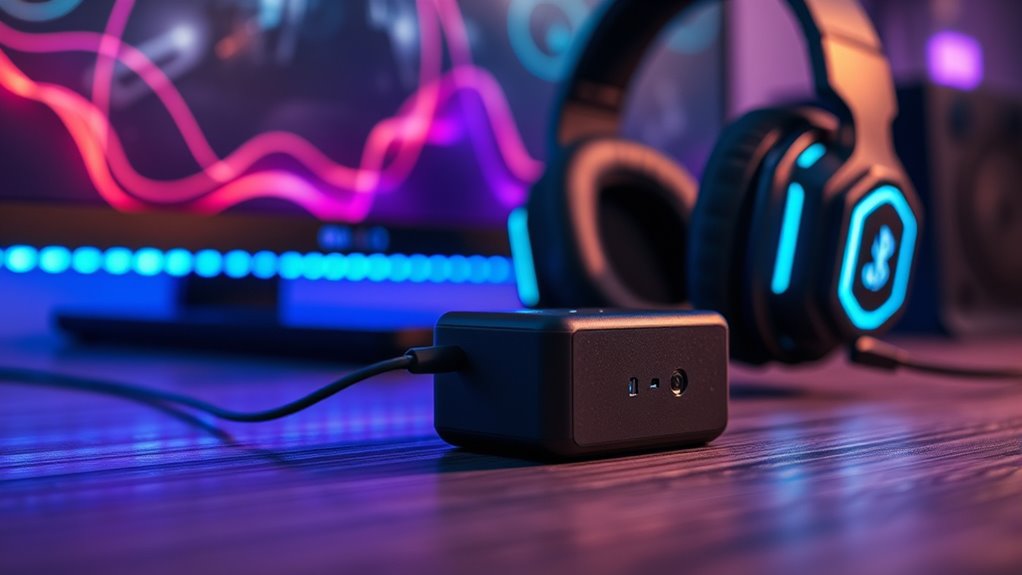 Choosing a Bluetooth audio transmitter that works seamlessly with your gaming setup requires verifying its compatibility with your devices. First, check that it supports your specific platforms, like PS5, Switch, PC, or Mac. Compatibility with your headphones’ Bluetooth version and codecs, such as aptX Low Latency or HD, is essential for ideal audio quality. Additionally, confirm that the connection type—USB-C, USB-A, 3.5mm, or RCA—matches your device’s available ports. If you plan to connect multiple headphones, ensure the transmitter supports dual-device pairing. Finally, opt for a model operating at Bluetooth 5.3 or higher to maximize range and stability. Proper compatibility ensures a smooth gaming experience without interruptions or audio lag.