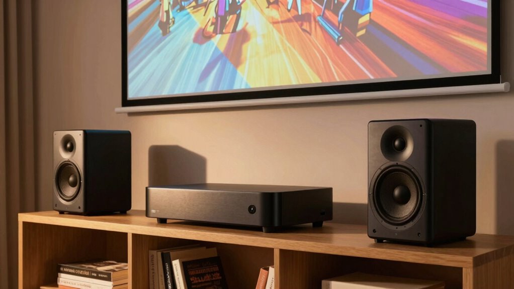 Imagine your living room transformed into a cinematic oasis, where rich, clear sound surrounds you like a warm embrace. With the right bookshelf speakers, your projector setup becomes a portal to immersive entertainment. Whether you choose sleek Bluetooth models or powerful active speakers, I promise you’ll feel every moment more vividly. So, pick your perfect match, set the scene, and let the audio elevate your viewing experience to unforgettable heights.