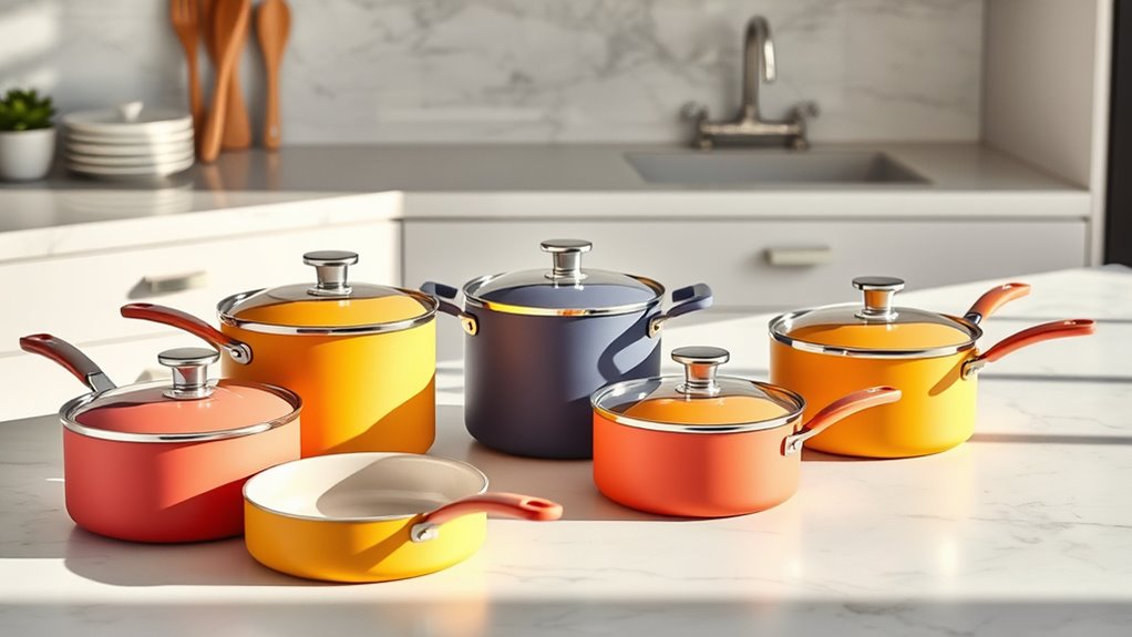 Ensuring your cookware set works seamlessly across all your appliances is essential for versatile and efficient cooking. I recommend checking that the set is compatible with your stovetop, whether induction, gas, or electric, to avoid surprises. Additionally, confirm the materials are oven-safe up to around 550ºF, allowing for versatile cooking methods. Pieces like griddles or Dutch ovens that transition effortlessly from stovetop to oven are valuable. It’s also important to verify that the non-stick ceramic coating performs well across different heat sources without degrading. Finally, consider storage options, like magnetic racks, that fit your kitchen space and organization style. Compatibility ensures you get the most out of your cookware, no matter your appliances or cooking preferences.