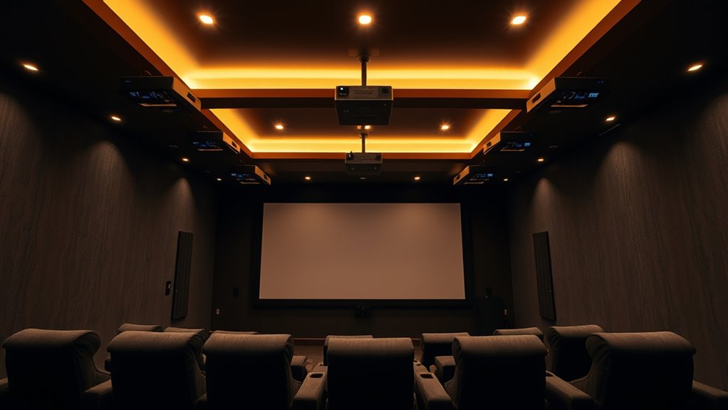 If you’re looking for the best ceiling mounts for your dedicated theater, I recommend options like the WALI Ceiling TV Mount, VIVO Extendable Projector Mount, and Mount-It! adjustable ceiling brackets. These supports are versatile, durable, and adjustable for perfect angles, ensuring your stage presence is first-rate. They cater to different display sizes and equipment, making setup flexible and secure. Keep going, and you’ll discover how to choose the perfect mounts for your space and needs.