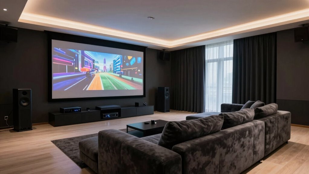 Remote control functionality is a game-changer for ceiling recessed projector screens, offering effortless operation that enhances your viewing experience. With this feature, I can easily adjust the screen’s position from across the room, eliminating the need for manual intervention. Many models come with both infrared (IR) and radio frequency (RF) remotes, which give me flexibility and minimize interference, especially when multiple screens are in use. Some advanced systems even allow programmable vertical drop positions, so I can set specific screen heights for different scenarios. Plus, remote controls with selectable channels let me control multiple screens simultaneously without worrying about signal conflicts. This integration truly makes quick adjustments seamless, whether I’m using it for presentations or enjoying a movie night.