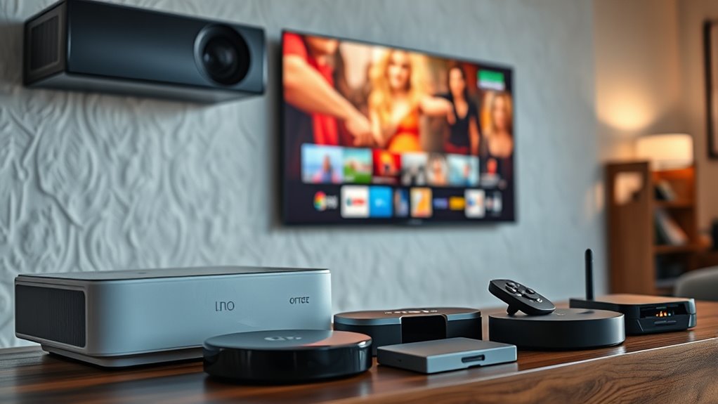 Many Chromecast alternatives support 8K or higher resolutions, making your viewing experience as crisp as a freshly polished apple. Devices like the NVIDIA Shield TV Pro and some high-end Roku models can handle 8K content seamlessly. I’ve found these options perfect for those wanting top-tier picture quality, ensuring your projector delivers stunning visuals that won’t disappoint, even at the highest resolutions.