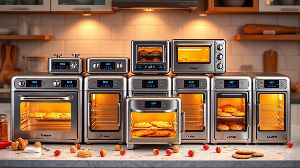The Cookeez Makery ovens come with several safety features I appreciate. They have cool-touch exteriors, so I don’t worry about burns, and the automatic shut-off system guarantees they turn off after a set time, preventing overheating. The non-slip base keeps it steady during use, and the easy-to-clean surfaces reduce mess-related hazards. Overall, I feel confident using it around kids because it’s designed with safety in mind.