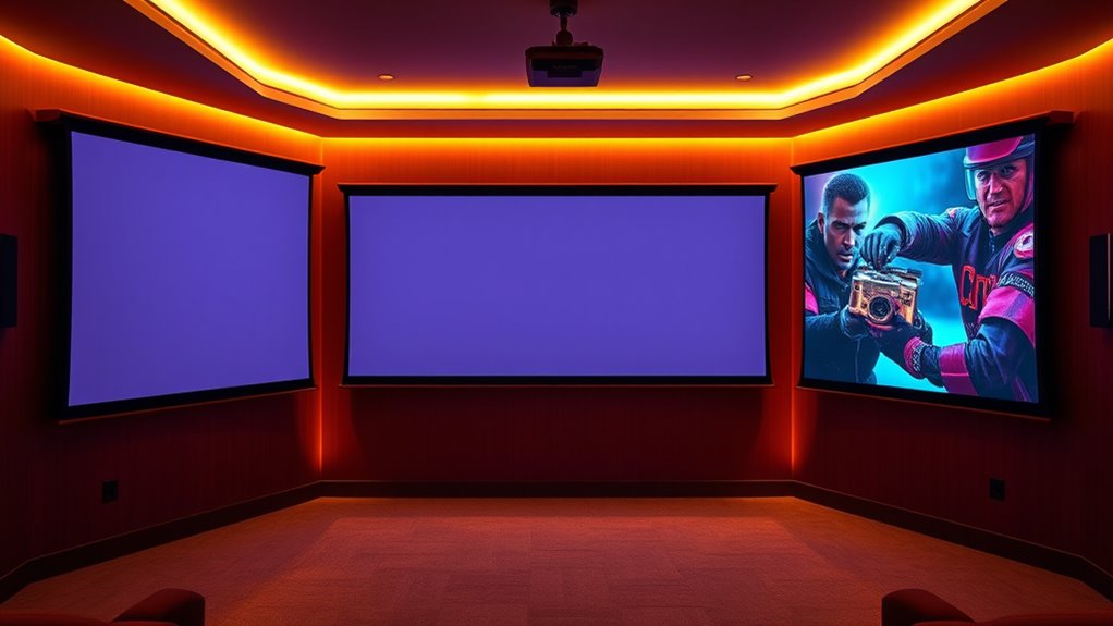 If you’re looking to upgrade your home theater, I’ve found some of the best DIY projector screen kits that are affordable and easy to set up. From elastic polyester surfaces to foldable screens, there are options for indoor and outdoor use with excellent image quality and wide viewing angles. Whether you want a material that resists wrinkles or a high-gain reflective surface, there’s something for everyone. Keep exploring to discover how these kits can transform your viewing experience.