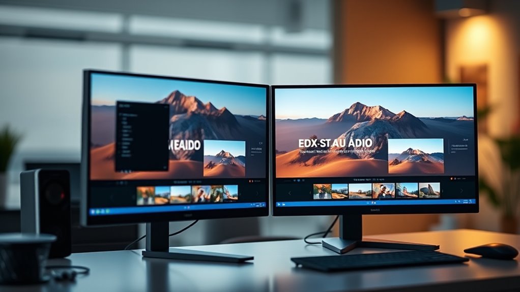 Choosing edge-blend correction software requires careful attention to hardware compatibility to guarantee smooth operation. First, I make sure the software supports my specific display or projection system’s model and version. Compatibility with my operating system and hardware interfaces, like HDMI, DisplayPort, or DVI, is essential to prevent connection issues. I also verify that the software can integrate seamlessly with my existing hardware components, including video processors and controllers. Equally important is confirming that the software supports my hardware’s resolution and refresh rate to avoid synchronization problems. Finally, I review any hardware-specific requirements or limitations documented by the software provider. Ensuring these factors are met helps maintain stability and performance during calibration and operation.