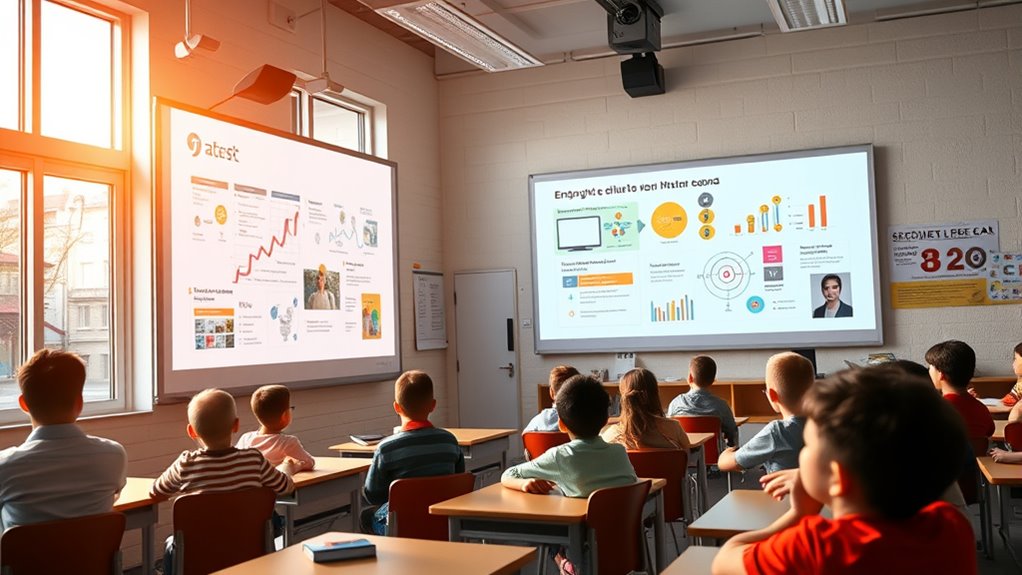 Selecting a projector with the right resolution is essential to guarantee clear and detailed visuals in a classroom setting. A 4K resolution offers approximately 3840 x 2160 pixels, providing four times the detail of 1080p, which translates into sharper images. Higher resolution standards improve clarity for complex diagrams, detailed texts, and high-resolution multimedia content. Native 4K support assures consistent image quality without upscaling artifacts, essential for accurate visual presentations. Resolution quality directly impacts student engagement by delivering crisper visuals, reducing eye strain, and making lessons more immersive. Additionally, adhering to established resolution standards assures compatibility with modern digital content and future-proofs your classroom technology investments, making 4K projectors a reliable choice for educational environments.