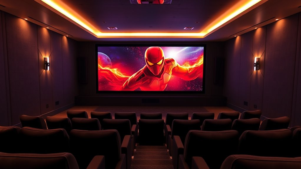 Looking for the best Epson ALR screens to create stunning home theaters in 2025? I’ve found top options like fixed frame screens, ultra-wide portable models, and motorized screens that feature advanced light-rejecting technology, sleek designs, and large sizes up to 150 inches. These screens excel in bright rooms, supporting 4K and 8K content for immersive viewing. Keep exploring the next sections to find out which one suits your setup perfectly.