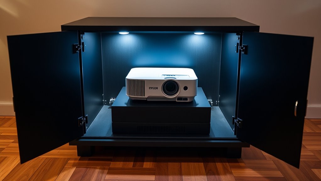 Choosing a cabinet that minimizes heat buildup is like finding a cool oasis in a desert. I focus on cabinets with proper ventilation, adjustable vents, and heat-resistant materials. I also look for units with integrated fans or airflow systems that keep the temperature steady. By guaranteeing the cabinet has enough space around the projector and good airflow, I protect my equipment from overheating and ensure it runs smoothly.
