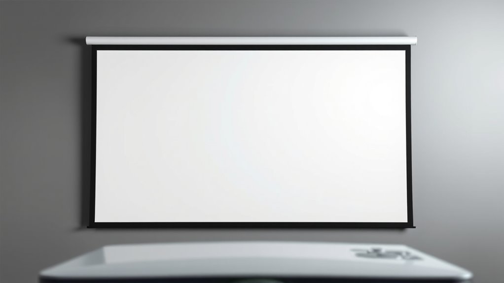 The aspect ratio of your Epson white projector screen shapes the overall viewing experience by defining the proportions of the projected image. Common options include 4:3, 16:9, and 16:10 formats, each suited to different media and preferences. Selecting the right aspect ratio guarantees your image fits the screen without distortion or black bars. For modern HD and 4K content, a 16:9 widescreen setup offers a cinematic experience. If you primarily use older media or need to give presentations, a 4:3 aspect ratio provides a more square shape. Some screens feature dual or adjustable aspect ratios, offering flexibility to switch between formats seamlessly. Your choice depends on the type of content you view most often and the space you have available.