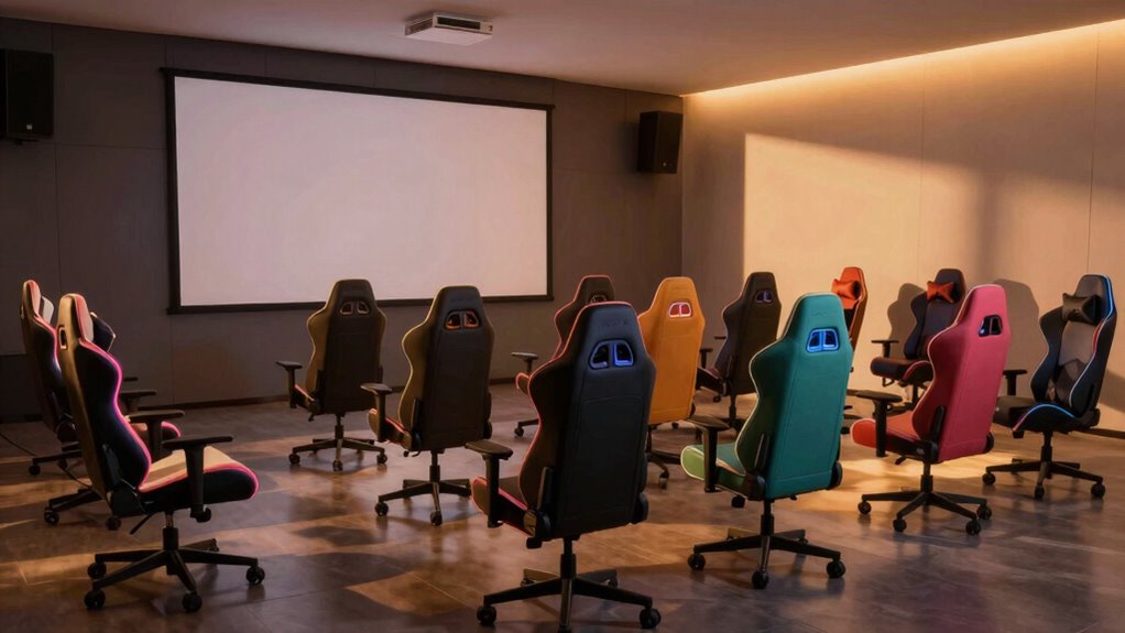 Choosing a gaming chair for your projector room isn’t just about comfort; it also plays an essential role in the overall aesthetic of the space. The right chair can enhance the room’s visual appeal and create a cohesive design theme. Think about color schemes—vibrant hues can energize the environment, while neutral tones can bring a calming effect. Unique design elements, like ergonomic shapes or futuristic looks, can make your setup inviting. Also, consider materials like PU leather or breathable mesh, which impact both comfort and style. Features such as LED lighting or embedded audio systems can further elevate the aesthetic, aligning perfectly with the immersive experience you want for your projector room.