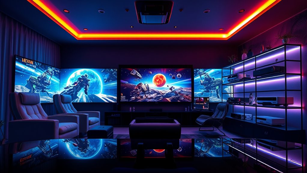 Latency is vital for an immersive gaming experience because it directly affects how quickly actions respond on screen. High latency causes noticeable lag, making gameplay feel sluggish and less realistic. I always prioritize low-latency projectors to guarantee smooth, responsive play. When latency is minimized, every move feels immediate, enhancing immersion and giving me a competitive edge. For truly immersive gaming, I recommend choosing a projector with ultra-low latency.