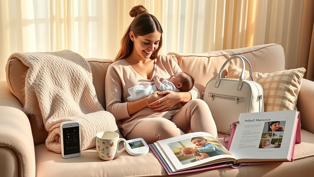To help a new mom relax and practice self-care, I recommend gifts like spa sets, cozy robes, or scented candles that create a calming atmosphere. A massage gift card or a subscription for meditation apps can also be perfect. I always look for thoughtful items that fit her routine, offering her moments of peace. These gifts remind her to prioritize her well-being, even amid busy days.
