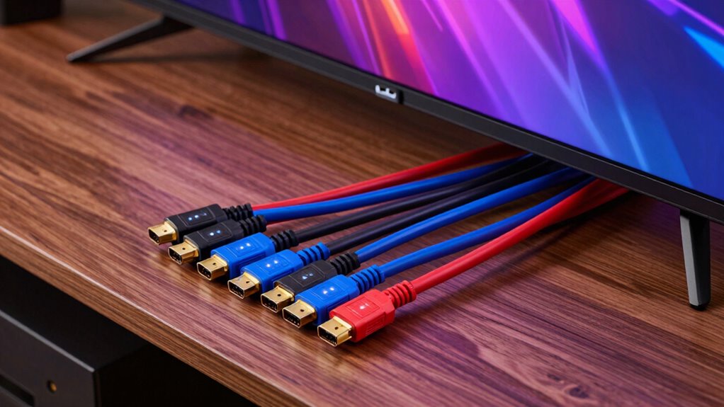 Think of HDMI 2.1 cables as busy highways—they can support multiple devices, but not all at once on the same lane. Typically, a single HDMI 2.1 cable connects one device to your display, so you need a proper setup with splitters or switchers to support multiple sources simultaneously. These tools help traffic flow smoothly, allowing you to switch between devices without unplugging or losing signal quality.