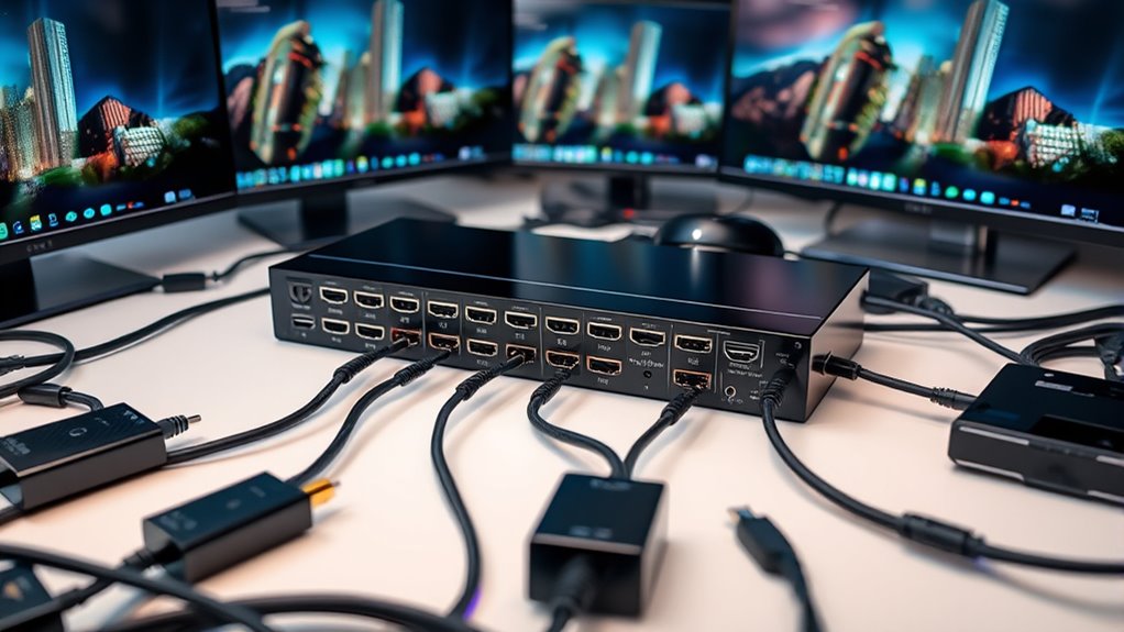 HDMI matrix switchers handle different resolutions and HDR formats by automatically recognizing and adapting to each connected device’s specifications. I’ve found they seamlessly switch between 4K, HDR, and other formats without any fuss. They use advanced chipsets to guarantee compatibility, maintaining picture quality and color accuracy. This flexibility means I can connect various devices, confident that my display will always show the best possible image, regardless of the source’s format.