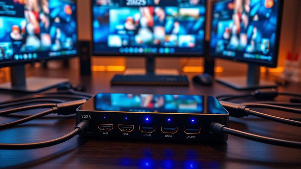 If you’re looking for the 15 best HDMI splitters for seamless multi-device setups in 2025, I recommend considering options like UGREEN’s multi-port switches, GANA’s bidirectional and splitter models, and MT-ViKI’s multi-output splitters, all supporting 4K@60Hz and HDR. These devices offer manual or remote switching, multiple outputs, and compatibility with various devices like gaming consoles and Blu-ray players. Keep in mind power needs and cable lengths for ideal performance. If you want detailed insights, you’ll find everything you need here.