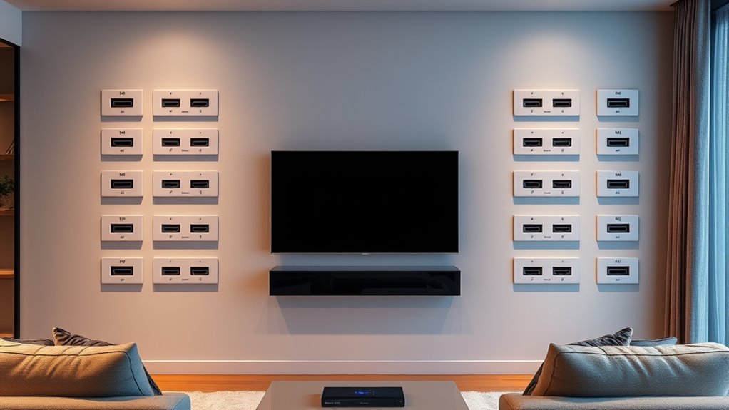 If you’re looking for the best HDMI wall passthrough kits, I recommend options like the Cable Matters 2-Pack, VCE Brush Wall Plate, and ELECTOP HDMI 2.1 Wall Plate. These kits offer sleek, high-quality solutions for seamless, clutter-free setups with support for 4K, HDR, and even 8K resolutions. They’re easy to install and perfect for hiding cables behind walls, making your home theater look professional. Stick around, and you’ll discover more top choices to suit your needs.